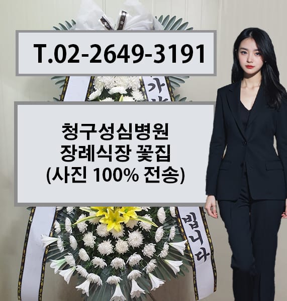 청구성심병원 장례식장 전화번호: 02-352-4445 주소: 서울특별시 은평구 통일로 873 청구성심병원 홈페이지: 청구성심병원 장례식장 홈페이지 <출처: 청구성심병원 장례식장> 특징: 고객만족을 최우선으로 생각하며, 올바른 장례문화를 선도하는 청구성심병원 장례식장 입니다. 고인에 대한 각별한 정성과 유가족을 생각하는 마음으로 준비해 드립니다. <장례식장 근조화환 주문 정보> 대표전화: 02-2649-3191 (친절히 상담해 드리겠습니다) 홈페이지 화환사진보기 위의 홈페이지에서 화환사진과 함께 자세한 설명도 확인하실 수...